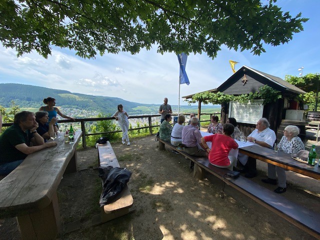 Danach ging es auf den Weinbaulehrpfad zur sog. Huxlay-Hütte. Bei herrlichem Wetter ging es bergauf und verlangte uns einige Anstrengung ab. So wurden die Haltepunkte mit besonders guter Aussicht und diversen Informationstafeln zur Rast und Aufnahme von Fakten über die Landschaft, die Weinlagen und Weinsorten sehr begrüßt.