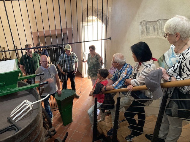 Diverse Arbeitsgeräte in gutem Zustand konnten wir ansehen und uns auch die Arbeitstechniken nahebringen lassen. Die Mehringer Ortsgeschichte in Bezug auf die Entwicklung des Weinbaues und der Dezimierung von Weingütern ließ uns nachvollziehen, wie die Entwicklung auch in anderen Weinregionen Deutschlands aussehen mag.