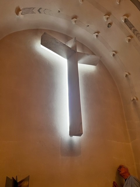 Vielleicht ist der Höhepunkt das Kreuz an der Wand über dem halb gebogenen und tief schwarzen Altar. Denn dieses Kreuz ist von hinten beleuchtet, scheinbar beleuchtet, um genau zu sein, denn das Licht, das sanft und leicht unscharf die Kreuzform begleitet, ist Tageslicht. Es wechselt also seinen Charakter von fast gleißend hell bis zum dämmerigen Abschluss eines Tages. Das Kreuz lebt sozusagen mit dieser Licht-Idee.