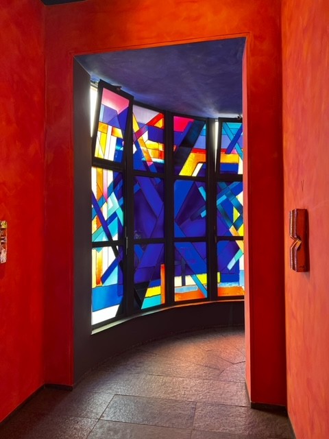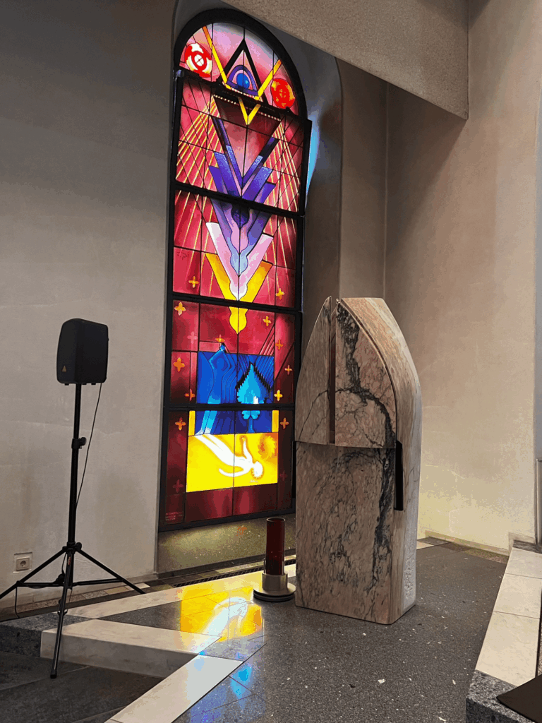 Eine geglückte Symbiose also aus christlichen Werten und den typischen Farben und Formen, Quadraten und Rechtecken, Kerben und Bögen, ja, des ganzen Repertoires eines zeitgenössische Künstlers. Mack zitiert biblische Elemente wie Vögel und Fische in seiner Formensprache zum Beispiel in einem wunderschönen Fenster im tiefen Blau, er umrahmt eine Orgel mit seinem Farbverlauf von Gelb über Türkis bis Dunkelblau, er schafft eine Mutter Gottes aus markanten Blöcken und ein Taufbecken mit einem sternenförmigen goldenen Mittelpunkt.