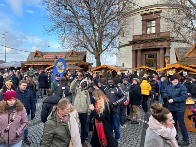 Ab 11.00 Uhr bis nach 13.00 Uhr sammelten sich die Familien am deutlich sichtbaren LIONS Tisch vor dem Riesenrad, um sich dort die Tickets abzuholen für eine Fahrt über die Dächer Düsseldorfs. Damit nicht genug, es gab zusätzlich Gutscheine für eine Bratwurst mit Brötchen und ein alkoholfreies Getränk nach Wahl für jeden. Denn was wäre der Besuch eines Weihnachtsmarktes ohne eine solche klassische Stärkung.